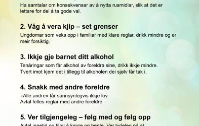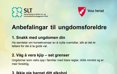 Ungdomstida er ei spanande, men også utfordrande tid. Det er ei tid for utvikling, utforsking og lausriving. Som føresette er de dei viktigaste rettleiarane for ungdomen dykkar i denne fasen av livet. SLT-gruppa i heradet jobbar tverrfagleg for å førebyggja rus og kriminalitet, og skapa eit trygt oppvekstmiljø. I dette arbeidet er samarbeidet med dykk foreldre heilt sentralt.Mange unge er nysgjerrige på alkohol og ser på det å eksperimenta med alkohol som ein del av ungdomstida. Me veit at alkohol aukar risikoen for ulykker, vald og overgrep, og at det kan opna døra for andre rusmiddel. Det er difor viktig at me vaksne set tydelege grenser og har gode samtalar med ungdomen.SLT-gruppa har utarbeida eit sett med anbefalingar som skal gjera det lettare for føresette å setja grenser.Saman kan me bidra til å skapa eit trygt og godt oppvekstmiljø for ungdomen vår.Takk for at de er engasjerte foreldre!