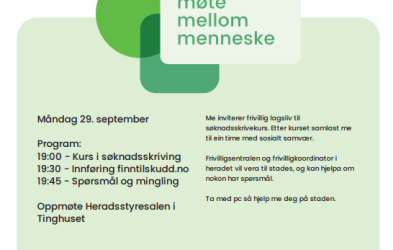 Saman med Voss frivilligsentral inviterer Voss herad frivillig lagsliv til kurs i søknadsskriving og informasjon om tilskotsportalen finntilskudd.no måndag 29.september 2025. Etter ein liten time med kurs og informasjon er det lagt opp til at ein kan stilla spørsmål til kommunen og elles få hjelp til det ein måtte ha behov for.