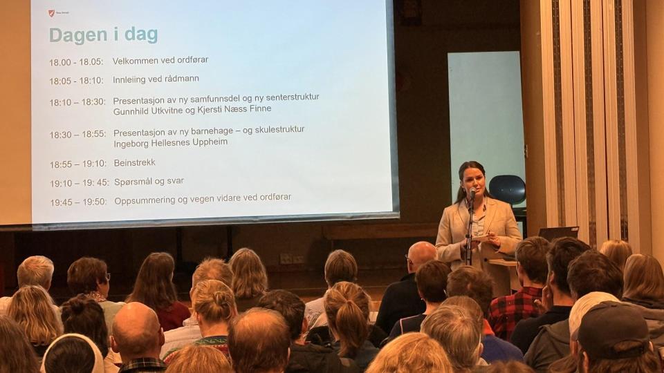 Fullsett gymsal på Evanger Vel 70 personar møtte opp på Evanger skule til folkemøte om ny samfunnsplan og ny barnehage-og skulestruktur.