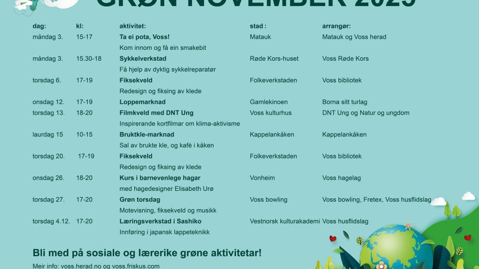 Grøn november Sjå det innhaldsrike programmet for Grøn november! Bli med på lærerike og sosiale aktivitetar heile månaden!