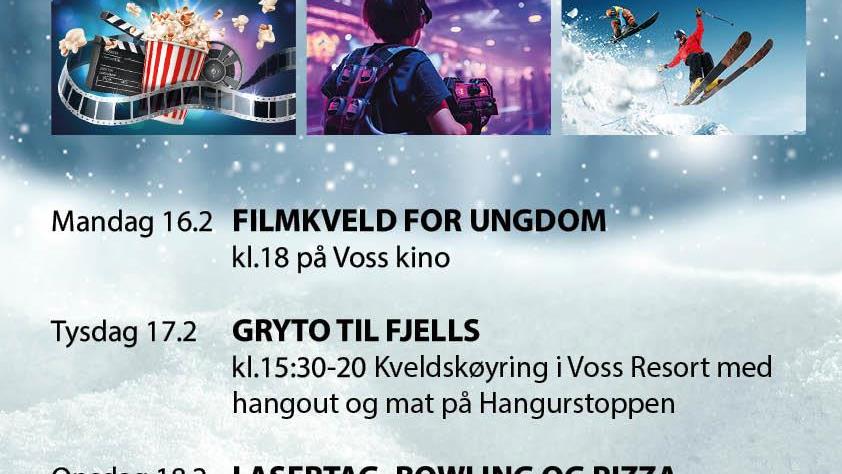 Gratis ferieaktivitetar for ungdom I samarbeid med frivillige lag og organisasjonar i Voss herad inviterer me ungdom 8.-10.trinn, busett i Voss herad, til gratis vinterferieaktivitetar. ...