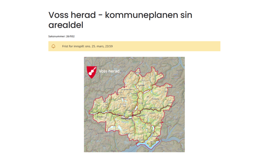 Innspel til arealdelen Voss herad er i gang med revisjon av kommuneplanen sin arealdel. I samband med dette vert det no opna for innspel fram til 25. mars 2026.