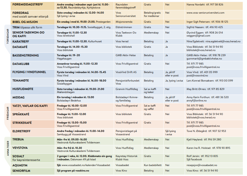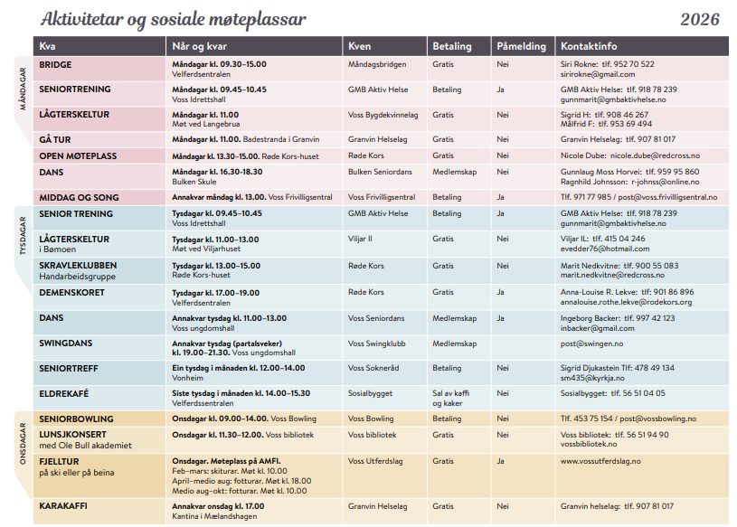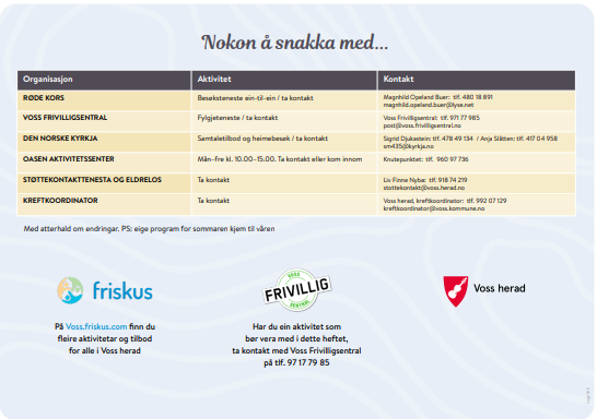 Voss Frivilligsentral ynskjer seg frivillige til besøksvenordninga, og til å hjelpa til i dei ulike aktivitetane dei driv. tlf. 56 51 03 70