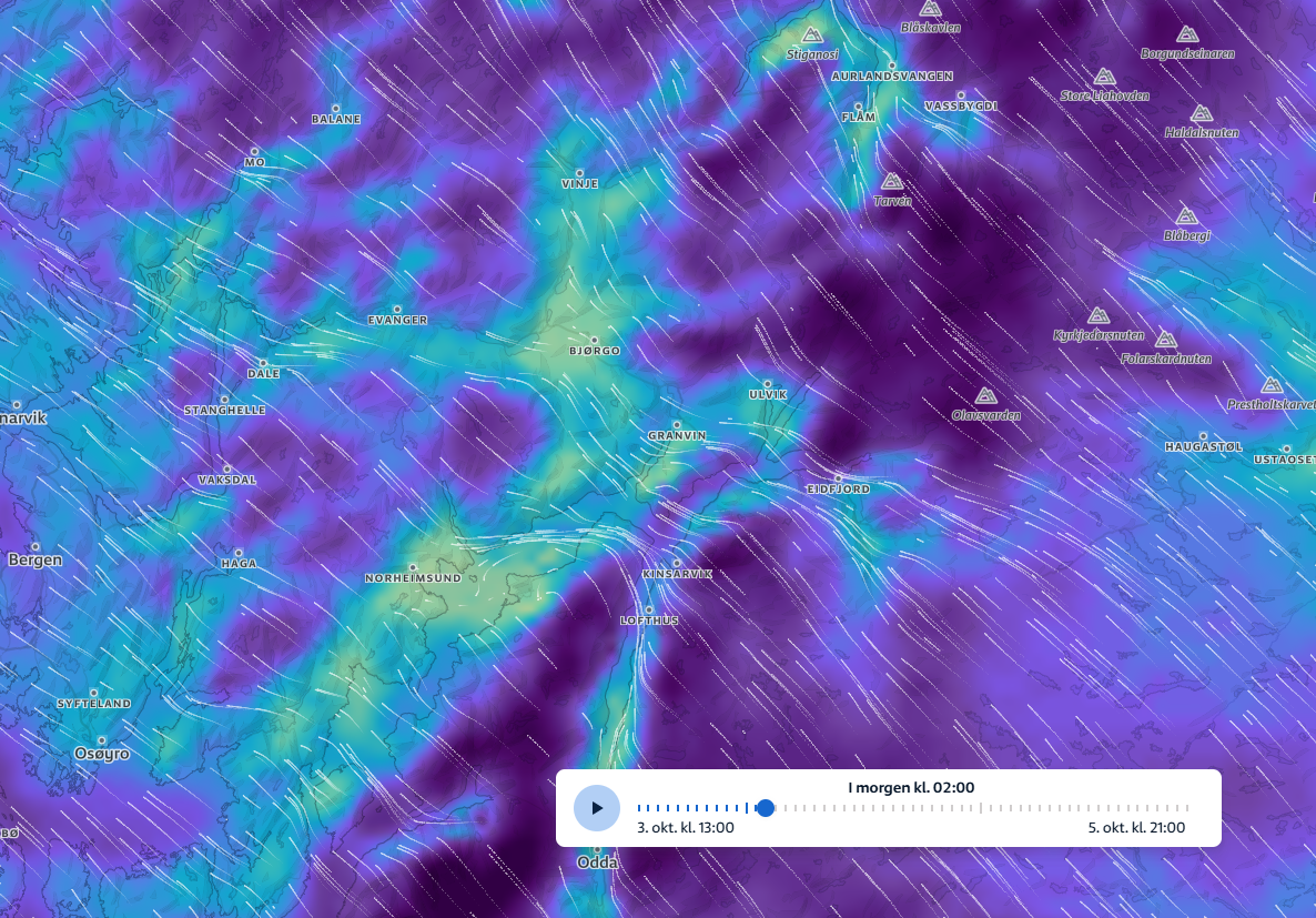 Den kraftigaste vinden er venta ved 2-tida natt til laurdag, og er venta å avta utover laurdag føremiddag.