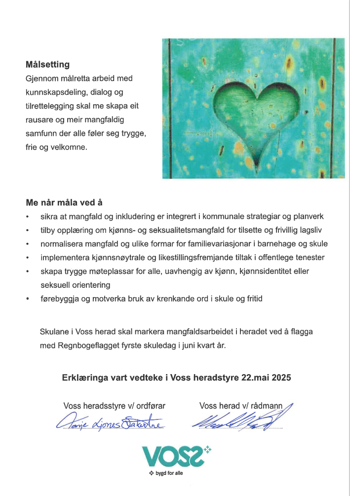 22. mai 2025 vart Mangfaldserklæringa til Voss herad politisk handsama og signerte av rådmann og ordførar.