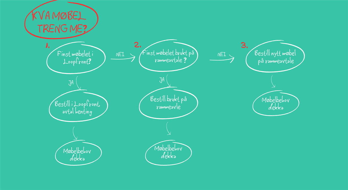 Voss herad er tilslutta Bergen kommune sin rammeavtale for møblar, og tidlegare i november tredde ein ny rammeavtale i kraft. I rammeavtalen er det ulike leverandørar etter ulike fagområde. Det som er nytt ved denne rammeavtalen er at møbelleverandørane skal kunna tilby brukte møblar i tillegg til nye, og difor skal me alltid sjekka om møbelet me treng finst brukt på rammeavtalen. Dersom møbelet ikkje finst korkje i Loopfront eller brukt på rammeavtale, kan ein kjøpa nytt.