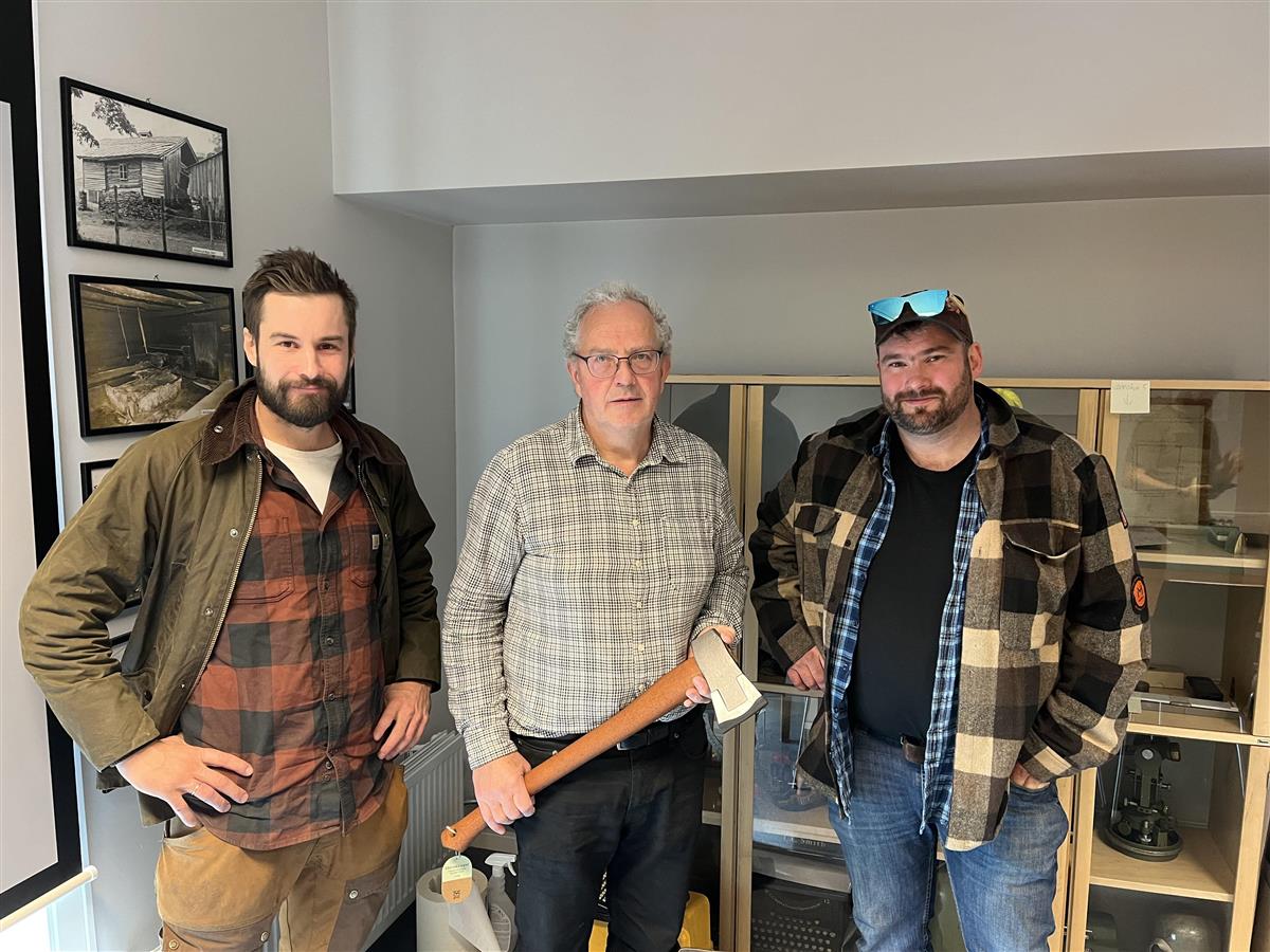 Kristian Skjerve, Anders Gjøstein og Bjørnar NedkvitneSistnemnde fekk også besøk på kontoret denne veka av Kristian Skjerve frå Voss skogeigarlag og Bjørnar Nedkvitne frå Voss bondelag, som hadde med seg ei øks i gåve som takk for 35 års samarbeid.