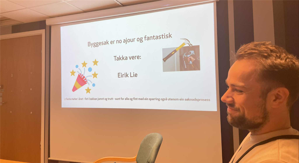 Det er kjent at byggesak hadde utfordringar om me går halvanna år tilbake, noko som òg uroa næringa. Grep vart tatt og på sist møte var stemninga ein litt annan. Her kunne ikkje møtet starta før fagleiar på byggesak, Eirik Lie, var på plass. Og, grunnen ser det på biletet. Næringslivet ynskte å hylla byggesaksavdelinga. Ei avdeling som no er ajour. Slike tilbakemeldingar er utruleg kjekke å få og viser at det er mogleg å snu utviklinga. Eirik som fagleiar og dei andre på avdelinga har gjort ein stor jobb.