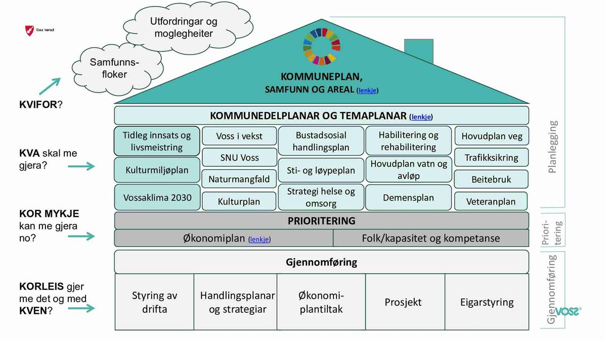 Forvirra over kva planar me har i Voss herad som seier noko om samfunnsutvikling og tenestene våre? Og korleis me skal styra etter dei? No kan det nye «styringshuset» hjelpa deg å få oversikt. Dette finn du i Compilo: Styring. Her finn du oversikt over kva me har av 12 årig kommuneplan, ulike fagplanar og kvar me prioriterer ressursar og tiltak for å nå desse. Me har i tillegg ulike planar for areal som du finn her: Planar og rapportar - Voss herad
