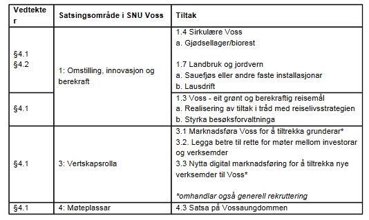 Med planen «Strategisk næringsutvikling i Voss herad» (SNU Voss) skal me jobba målretta med nærings- og samfunnsliv på Voss. Andre relevante planar for næringsutvikling er eksempelvis Reiselivsstrategi for Voss, Vossaklima og Voss i vekst.